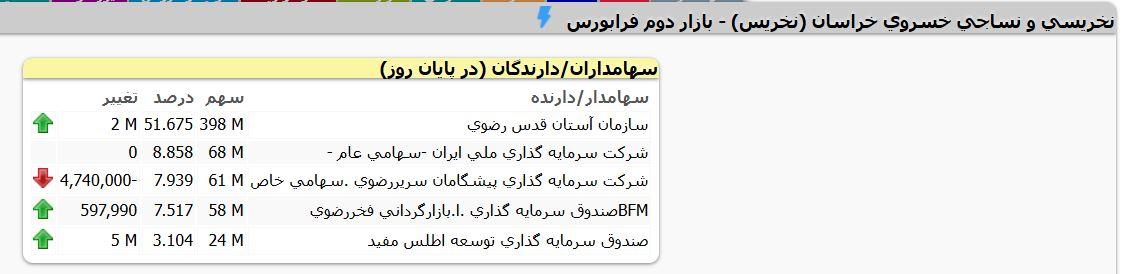 در ضمن در بازار عادی سهامدار عمده شرکت یعنی آستان قدس رضوی بیش از 1.5 میلیون سهم نخریس را خریداری نمود.