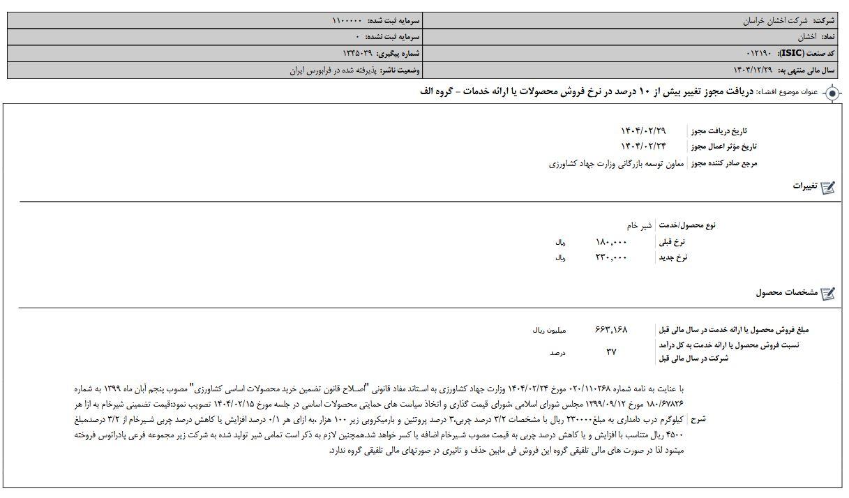 مجمع عمومی عادی سالیانه شرکت اخشان خراسان روز 14 مرداد 1404 با حضور 75.61 درصد سهامداران برگزار شد و با تصویب مجمع از سود 969 ریالی ایجاد شده مبلغ 100 ریال بین سهامداران تقسیم شد.
