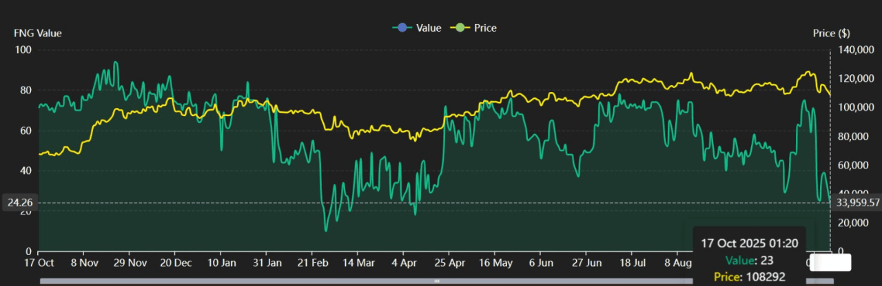 دادههای Coinperps نشان میدهد که احساسات بازار به شدت به سمت ترس بازگشته است. این سطح آخرین بار در آوریل فروردین مشاهده شده بود و در آن زمان بیت کوین زیر ۸۰,۰۰۰ دلار معامله میشد.