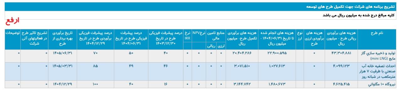 *توليد و ذخيره سازي گاز مايع mini LNG ،با هزینه ی برآوردی تکمیل طرح معادل 2.040 میلیارد تومان که تاریخ برآوردی بهره برداری از طرح در شهریور1405 اعلام شده است.