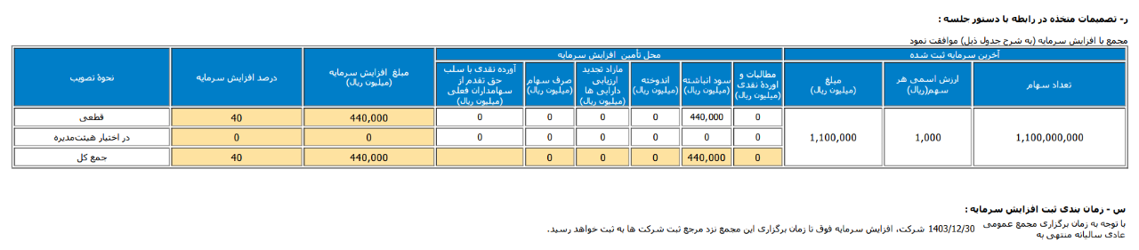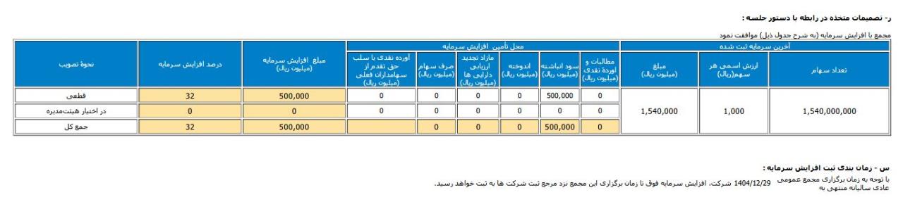 سرمایه شرکت: 154 میلیارد تومان سود انباشته: 54 میلیارد و 100 میلیون تومان سهام شناور: در تاریخ 31 تیر 1404 مقدار 28.76 درصد قیمت سهم: 4959 ریال