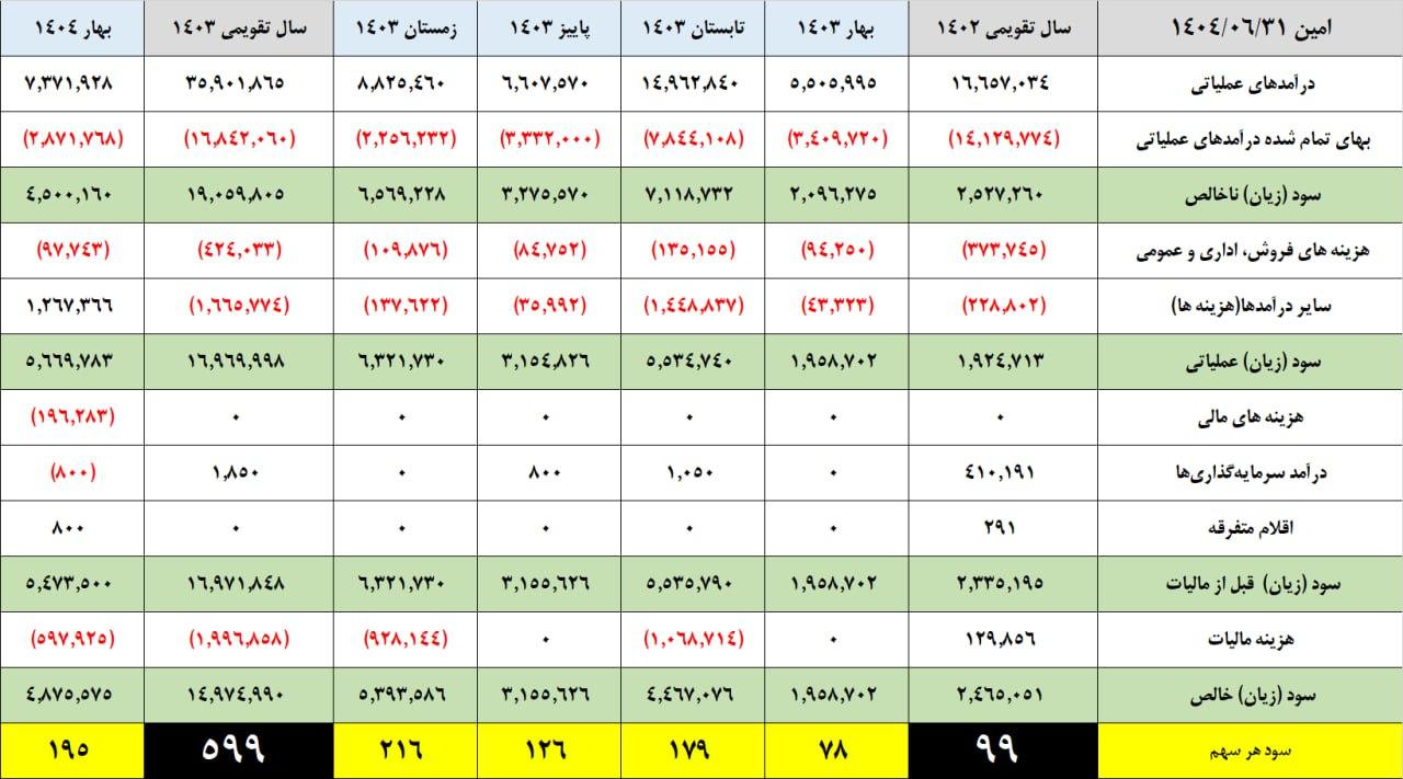 بریم ببینیم چی شد. سال گذشته فقط بهار خوب بود و فصول بعد افت جدی عملکرد داشت و حتی زمستان بواسطه هزینه مالی سنگین زیان ساخت. حال بهار با رشد 55% الی 100% نرخ محصولات و فروش خوب و حاشیه سود خوب 53% به این عملکرد رسید. فصول بعد احتمالا حاشیه سود کمتر بشه و به حوالی 45% برسه ولی در صورت حفظ روند تولید و فروش می تونه این عملکرد رو ادامه بده.
