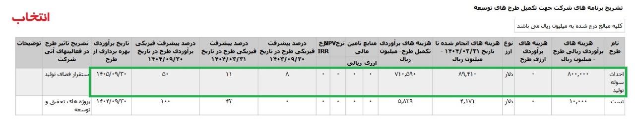 * احداث سوله تولید ،با هزینه ی برآوردی تکمیل طرح معادل 7 میلیارد تومان که تاریخ برآوردی بهره برداری از طرح آذر 1405 اعلام شده است.