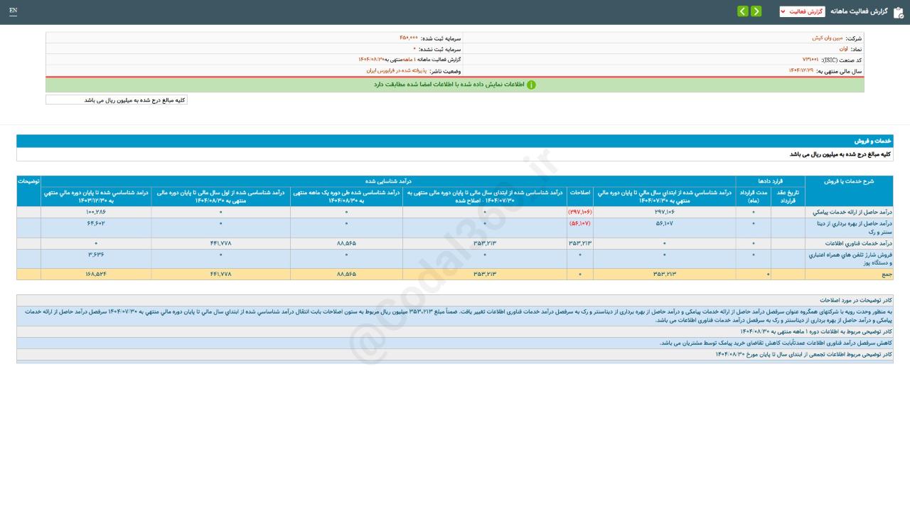 ▪️ شرکت مبین وان کیش طی عملکرد 1 ماهه منتهی به 14040830 مبلغ معادل 88,565 میلیون ریال، از محصولات خود را به فروش رسانده که نسبت به مدت مشابه سال قبل 349 درصد رشد داشته است.