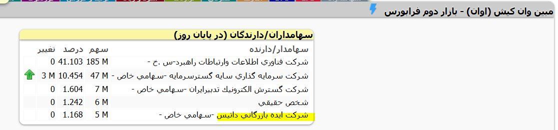 در روز معاملاتی 19 آذر 1404 شركت ايده بازرگاني داتيس با فروشی که در نماد #اوان داشت از جمع سهامداران بالای یک درصد خارج شد. ضمناً این شرکت هفته قبل به بالای یک درصد آمده بود!