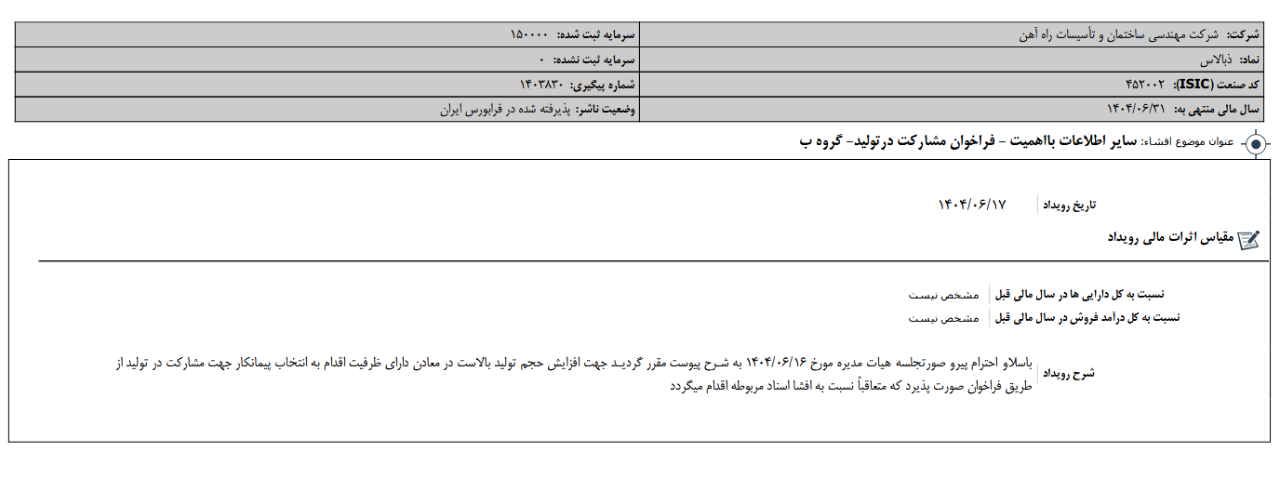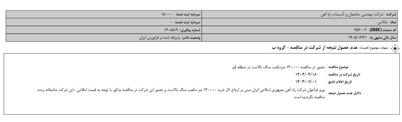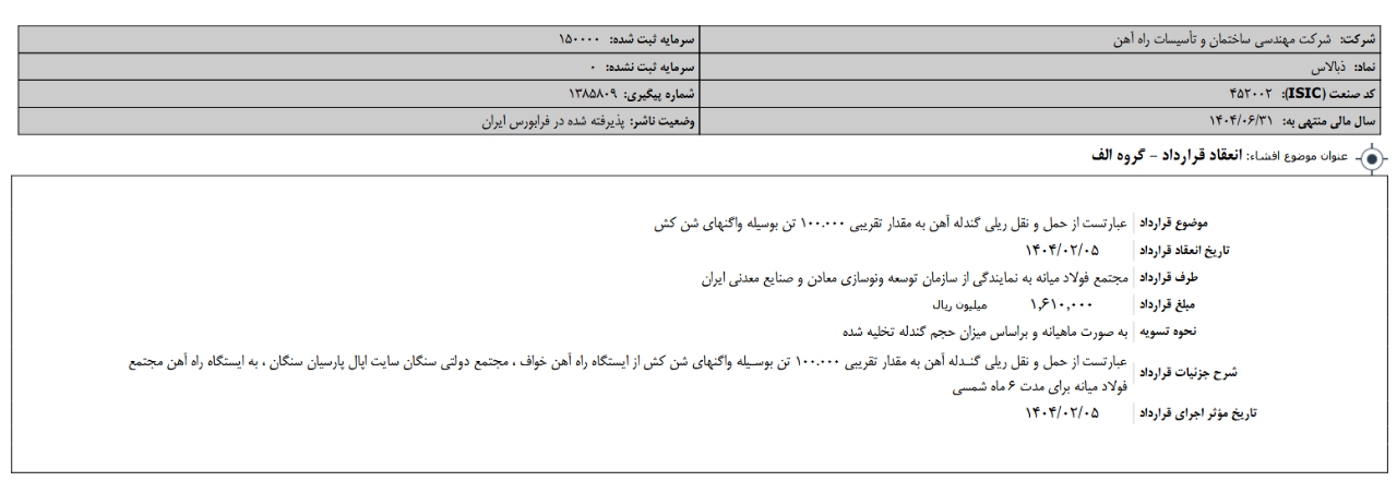 شرکت کارگزاری بانک مسکن طی نامه ای که روز 30 مهربه سازمان فرابورس داده اعلام کرده مقدار 63 میلیون و 491 هزار و 25 سهم معادل 42.32 درصد سهام مدیریتی کنترلی شرکت مهندسي ساختمان تاسيسات راه آهن در قیمت پایه 120556 ریال در روز 20 آبان 1404 به نمایندگی از شرکت گروه مالی بانک مسکن عرضه خواهد شد.بصورت نقد! قیمت فعلی سهم در روز 3 آبان 44450 ریال میباشد.