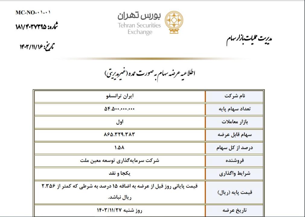 شرکت کارگزاری بانک ملت طی نامه ای که روز 30 فروردین به سازمان بورس داده اعلام کرده تعداد 865 میلیون و 329 هزار و 383 سهم معادل مقدار 1.58 درصد سهام غیرمدیریتی شرکت ایران ترانسفو در قیمت پایه قيمت پایانی روز قبل از عرضه به اضافه 15 درصد.در روز 8 اردیبهشت 1404 به نمایندگی از شرکت سرمايه گذاری توسعه معین ملت عرضه خواهد شد.بصورت نقد . قیمت فعلی سهم در روز 3 اردیبهشت ماه 3230 ریال میباشد.