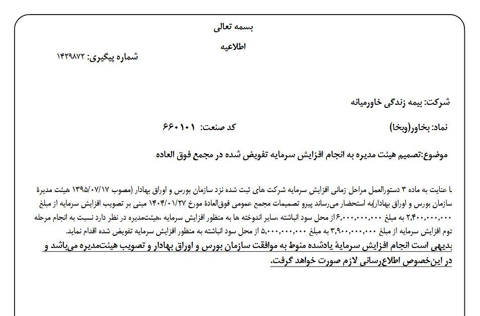 مجمع عمومی عادی به طور فوقالعاده شرکت بیمه زندگی خاورمیانه سهامی عام، چهارم شهریورماه 1404 در سالن اجتماعات بانک خاورمیانه برگزار شد.