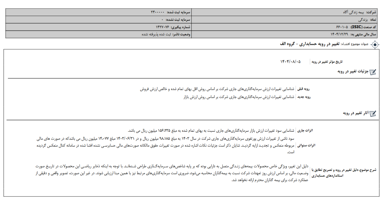 مجمع عمومی عادی سالیانه شرکت بيمه زندگي آگاه روز 30 تیر 1404 با حضور 84.02 درصد سهامداران برگزار شد و با تصویب مجمع از سود 333 ریالی ایجاد شده مبلغ 34 ریال بین سهامداران تقسیم شد.