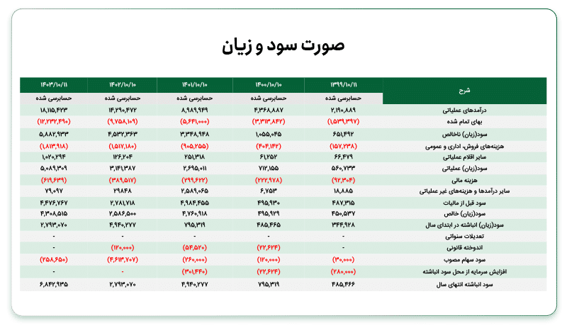 از سال ۱۳۹۹ تا پایان سال ۱۴۰۳، سود ناخالص شرکت رشد قابل قبولی داشته است؛ به طوری که از حدود ۶۵۱ میلیارد ریال در سال ۱۳۹۹ به ۵,۸۸۳ میلیارد ریال در سال ۱۴۰۳ رسیده است که نشاندهنده بهبود چشمگیر عملکرد در این بخش است. سود عملیاتی نیز در همین بازه با افزایش همراه بوده و از ۵۶۰ میلیارد ریال به بیش از ۵,۰۸۹ میلیارد ریال رسیده است، که نشاندهنده مدیریت بهتر هزینهها و افزایش کارایی عملیاتی شرکت است.