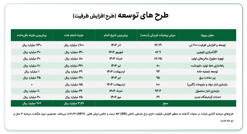 طرحهای توسعه شرکت کوچین طی سالهای اخیر با هدف افزایش ظرفیت تولید و بهبود زیرساختهای عملیاتی بهصورت پیوسته اجرا شدهاند. این پروژهها شامل توسعه و افزایش ظرفیت ۲۰۰ تنی، تکمیل سیستم CIP مرکزی، تهویه مطبوع سالنهای تولید، راهاندازی خط تولید دابودشت، توسعه تصفیه خانه، زیرساختهای برق و بازسازی انبار مواد و ملزومات هستند. میزان پیشرفت فیزیکی این پروژهها بین ۶۹ تا ۱۰۰ درصد گزارش شده و پیشبینی میشود تا پایان سال ۱۴۰۴ به اتمام برسند. هزینه انجام شده تاکنون حدود ۳,۱۶۱ میلیارد ریال است و هزینه باقیمانده حدود ۹۰۷ میلیارد ریال برآورد شده است. نرخ بازده داخلی IRR این سرمایهگذاریها ۵۳ درصد بوده و دوره بازگشت سرمایه ۳ سال و ۲ ماه پیشبینی میشود که نشاندهنده کارایی بالای این طرحها در ارتقاء عملکرد شرکت است.