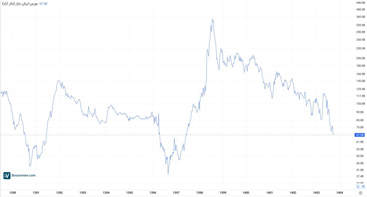 در اینجا صرفا ارزش دلاری بازار بورس مورد بررسی است. مقایسه ارزش دلاری بورس به لحاظ تاریخی، دید بهتری نسبت به مجموع بورس ها می دهد. در این سال ها، بورس میزبان عرضه اولیه هایی در سایز بسیار بزرگ بوده که نسبت به سال 1391 یا 1396 قابل توجه است.