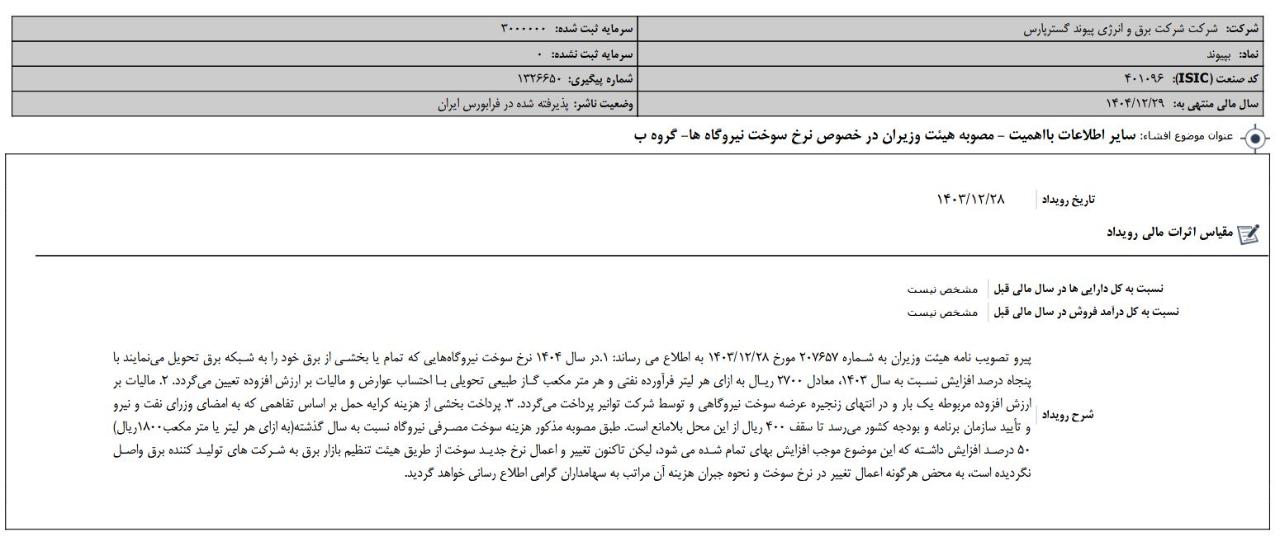 افشای اطلاعات بااهمیت،مصوبه هیئت وزیران در خصوص نرخ سوخت نیروگاه ها- گروه ب