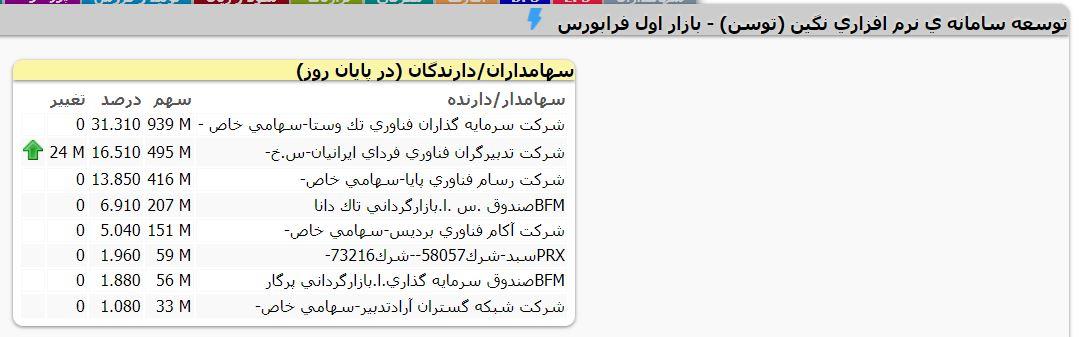 در ضمن در بازار عادی شركت تدبيرگران فناوري فرداي ايرانيان اقدام به فروش 2.4 میلیون سهم نمود.
