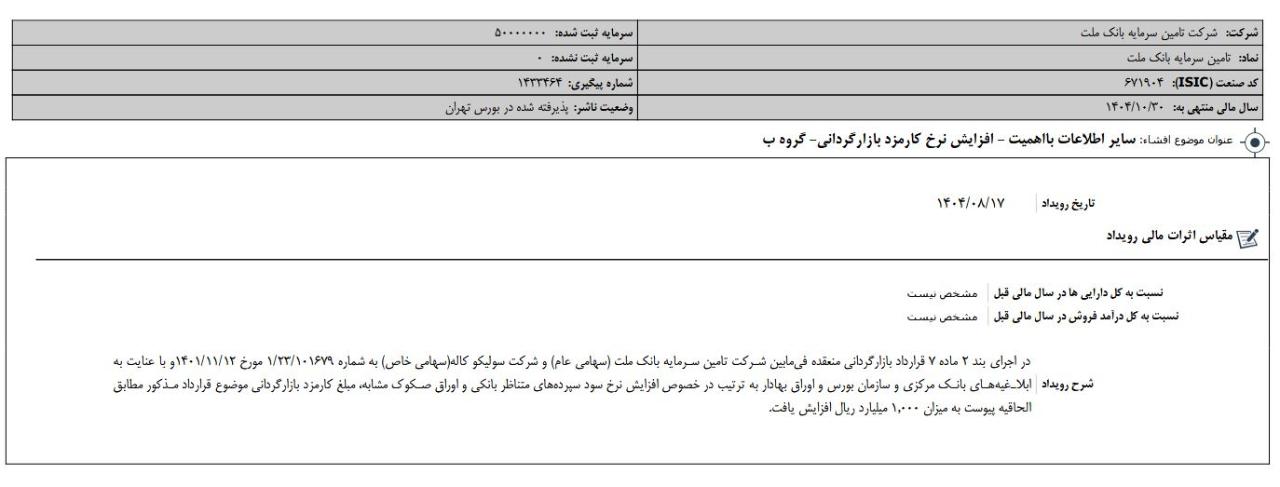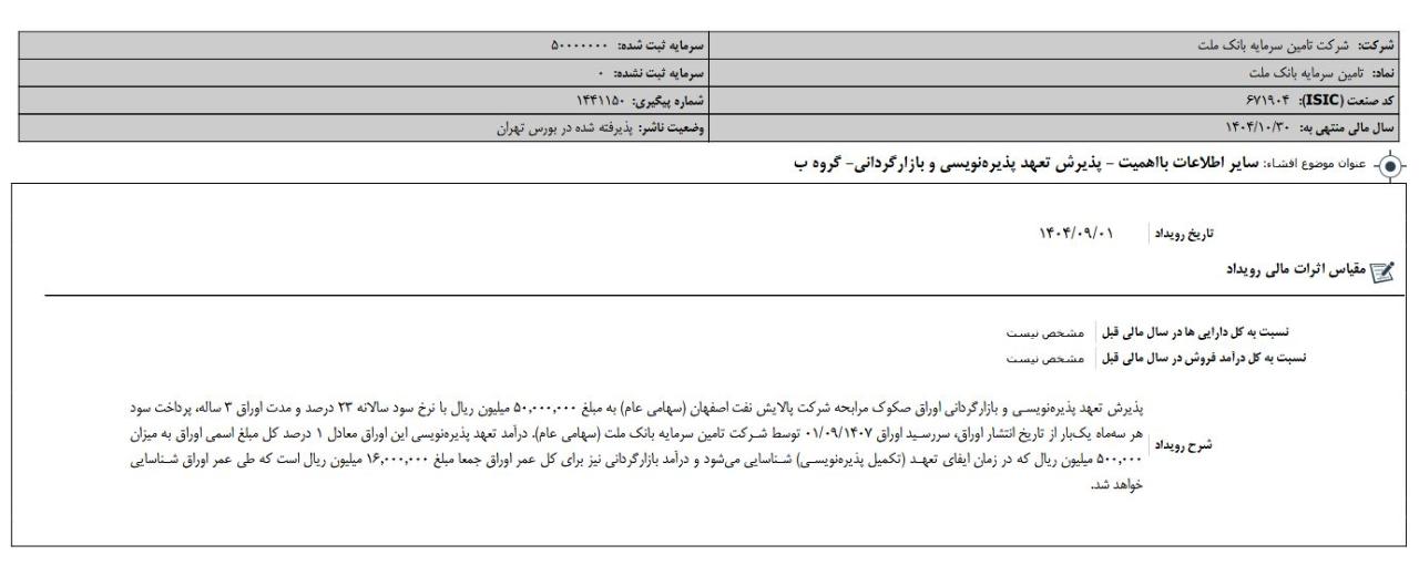 #تملت پذیرش تعهد پذیرهنویسی و بازارگردانی اوراق صکوک مرابحه شرکت پالایش نفت اصفهان سهامی عام به مبلغ 50,000,000 میلیون ریال با نرخ سود سالانه 23 درصد و مدت اوراق ۳ ساله، پرداخت سود هر سهماه یکبار از تاریخ انتشار اوراق، سررسید اوراق 01091407 توسط شرکت تامین سرمایه بانک ملت سهامی عام. درآمد تعهد پذیرهنویسی این اوراق معادل ۱ درصد کل مبلغ اسمی اوراق به میزان 500,000 میلیون ریال که در زمان ایفای تعهد تکمیل پذیرهنویسی شناسایی میشود و درآمد بازارگردانی نیز برای کل عمر اوراق جمعا مبلغ ۱۶,۰۰۰,۰۰۰ میلیون ریال است که طی عمر اوراق شناسایی خواهد شد.