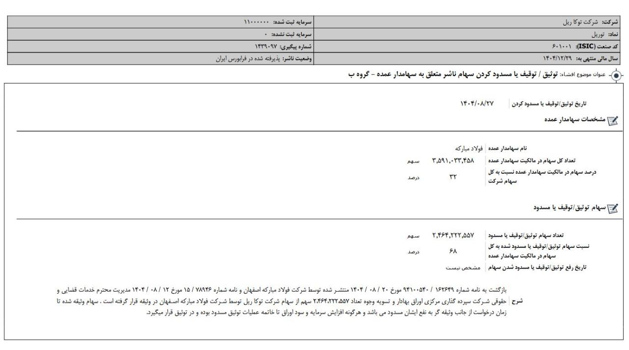 در نماد توریل امروز 12 آیان 1404 تعداد 40 میلیون سهم به صورت بلوکی معامله گردید