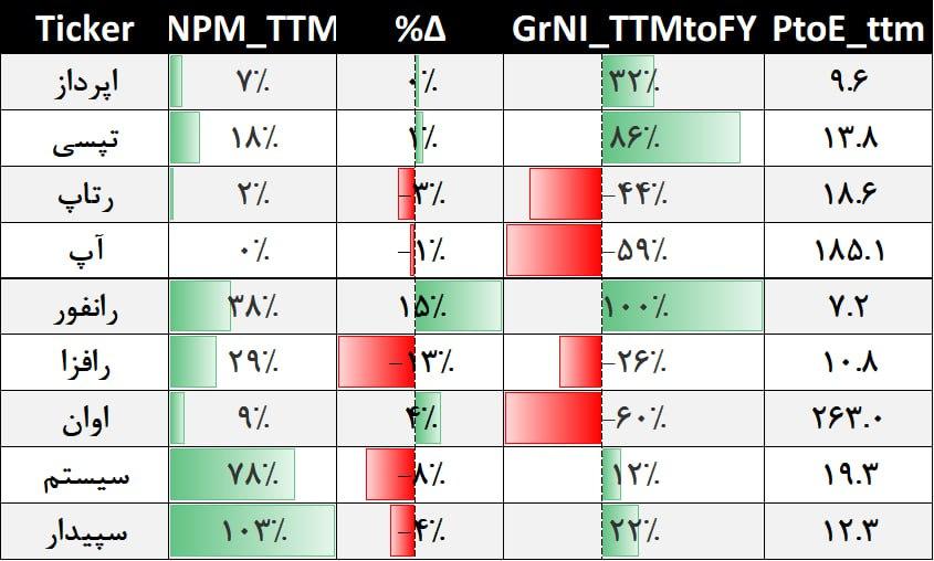 #اپرداز بیشترین نرخ رشد را ثبت کرده اند. همچنین رانفور، اوان و تپسی توانسته اند حاشیه سود خالص را نسبت به دوره قبل 1 تا 15درصد بهبود ببخشند.