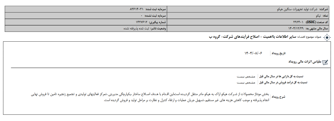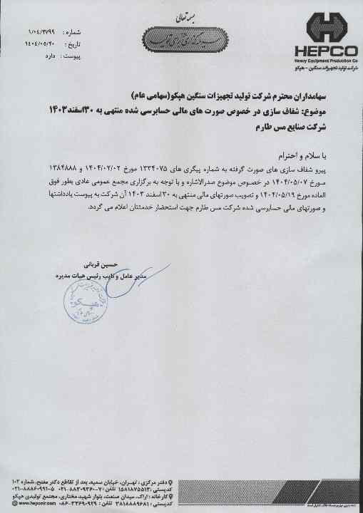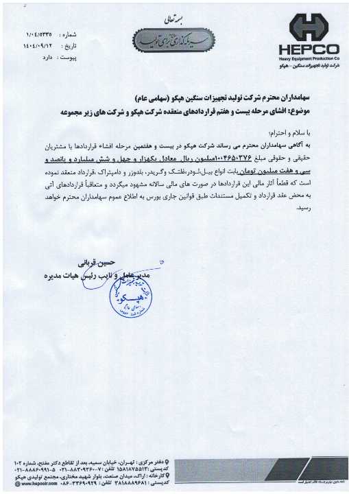 قربانی: شرکت هپکو در حال مذاکره با چند مشتری برای انعقاد قراردادهای جدید در حوزه تولید ماشینآلات و خدمات فنی و مهندسی است. برخی از این مذاکرات در مراحل نهایی قرار دارند و پس از انعقاد رسمی، از طریق سامانه کدال اطلاعرسانی خواهد شد.