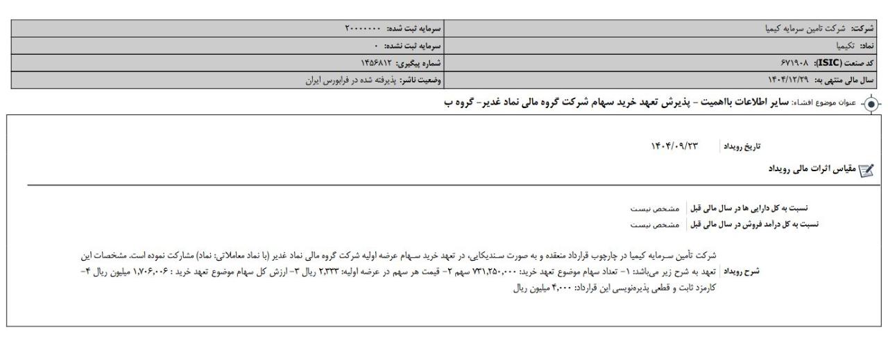 فروشنده و خریدار تامين سرمايه كيميا در این معامله بلوکی حقوقی بود.قیمت هر سهم 1409 ریال بود.