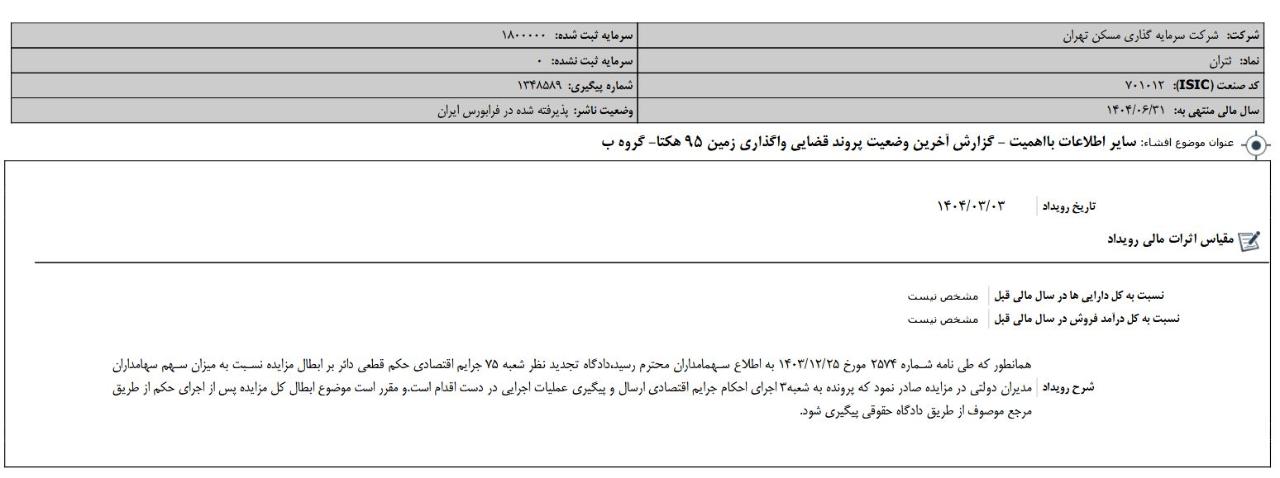 #ثتران با عنایت به تکلیف بند ب از ماده 13 دستور العمل افشای اطلاعات شرکتهای ثبت شده نزد سازمان بورس، در خصوص شکایت این شرکت علیه بانیان و متصدیان فروش زمین موسوم به یک هکتاری شهریار به استحضار جنابعالی و سهامداران محترم می رساند، به موجب دادنامه صادره از شعبه 75 تجدید نظر به شماره 140368390019417129 له شرکت سرمایه گذاری مسکن تهران دائر بر ابطال مزایده به میزان سهم متهمان بر مبنای مفاد نظر کارشناسی در شرکت تعاونی اتحاد سازان طبیعت صادر و اعلام شده است. بدیهی است اطلاعات تکمیلی پس از اجرای حکم بلافاصله به اطلاع آن مرجع و سهامداران محترم خواهد رسید.