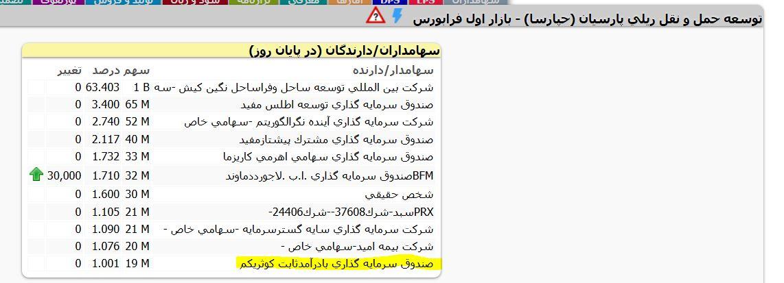 فروشنده #حپارسا در معامله بلوکی روز 26 شهریورماه صندوق سرمایه گذاری سهامی اهرمی جهش فارابی بود که با این فروش از جمع سهامداران بالای یک درصد این شرکت خارج شد.