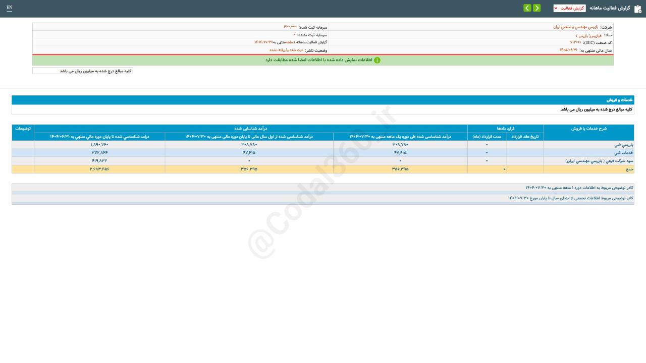 مجمع عمومی عادی سالیانه شرکت بازرسي مهندسي و صنعتي ايران روز 8 آذر 1404 با حضور 76.01 درصد سهامداران برگزار شد و با تصویب مجمع از سود 1962 ریالی ایجاد شده 1200 ریال بین سهامداران تقسیم شد.