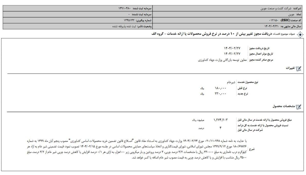 افشای اطلاعات بااهمیت،دريافت مجوز تغيير بيش از 10 درصد در نرخ فروش محصولات یا ارائه خدمات - گروه الف