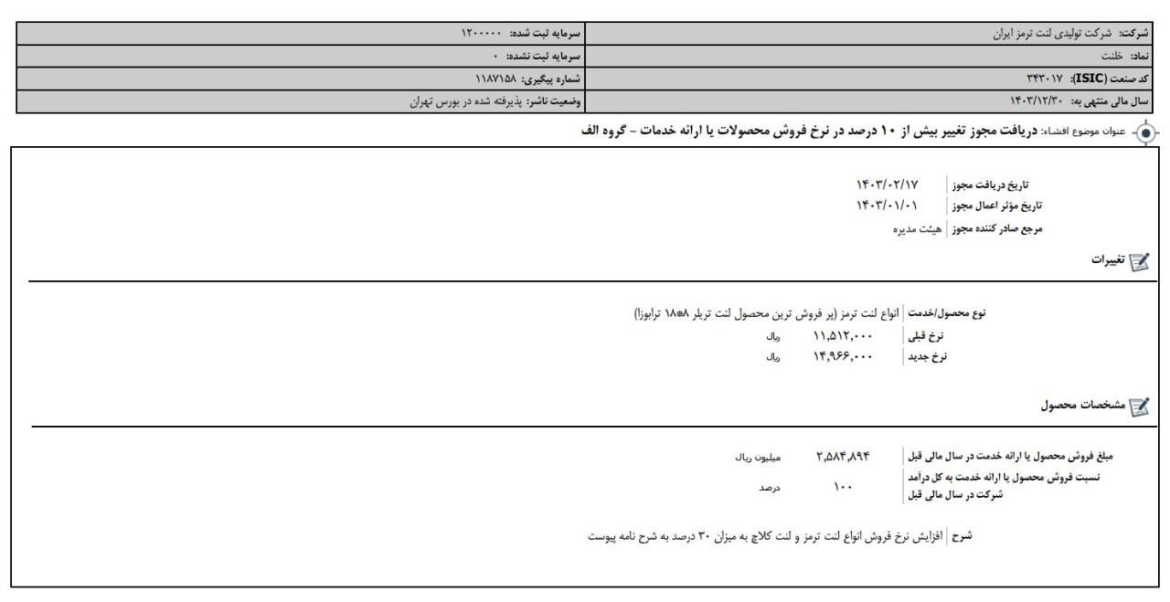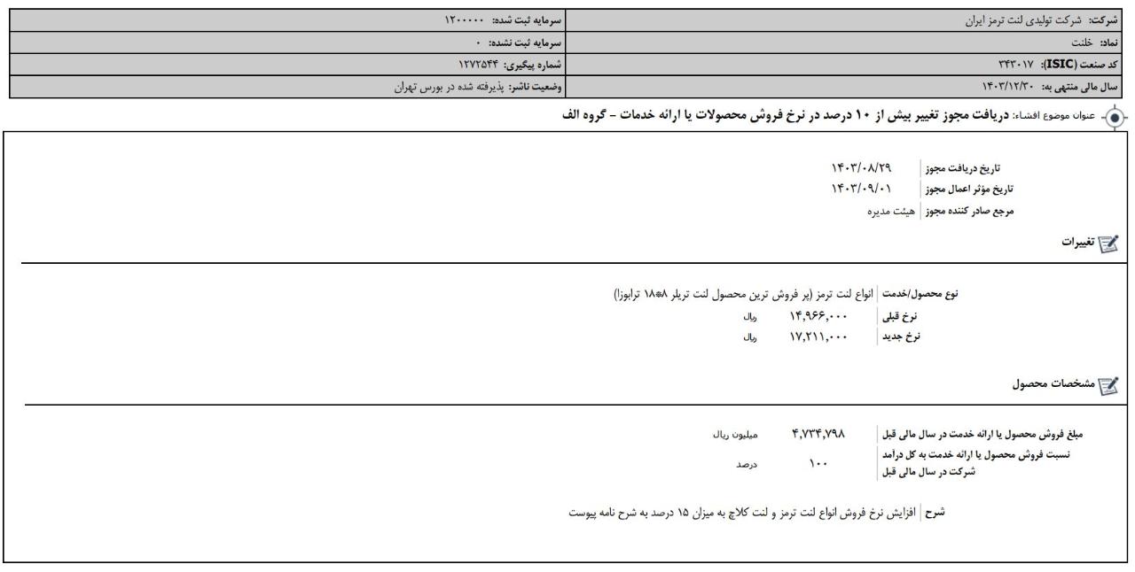 افشای اطلاعات بااهمیت،دريافت مجوز تغيير بيش از 10 درصد در نرخ فروش محصولات یا ارائه خدمات - گروه الف