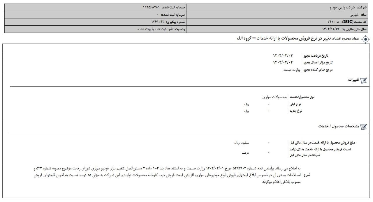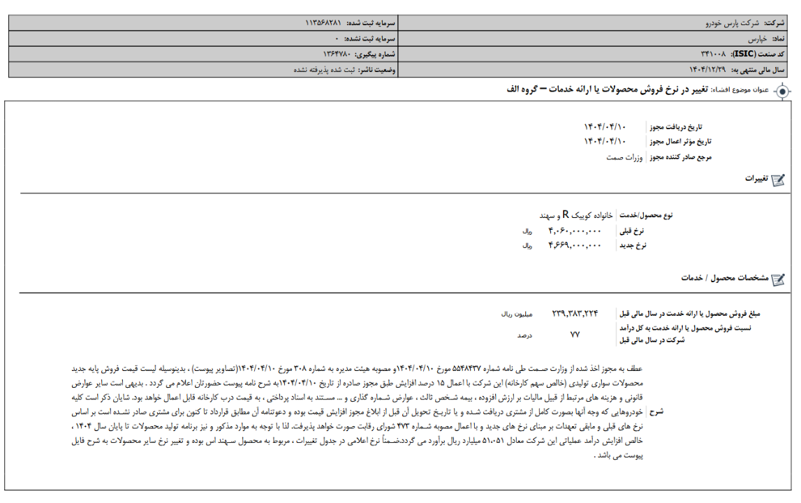 افشای اطلاعات بااهمیت،دريافت مجوز تغيير بيش از 10 درصد در نرخ فروش محصولات یا ارائه خدمات - گروه الف