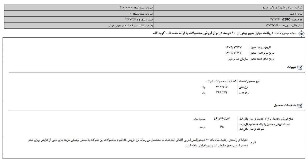 افشای اطلاعات بااهمیت،دريافت مجوز تغيير بيش از 10 درصد در نرخ فروش محصولات یا ارائه خدمات - گروه الف