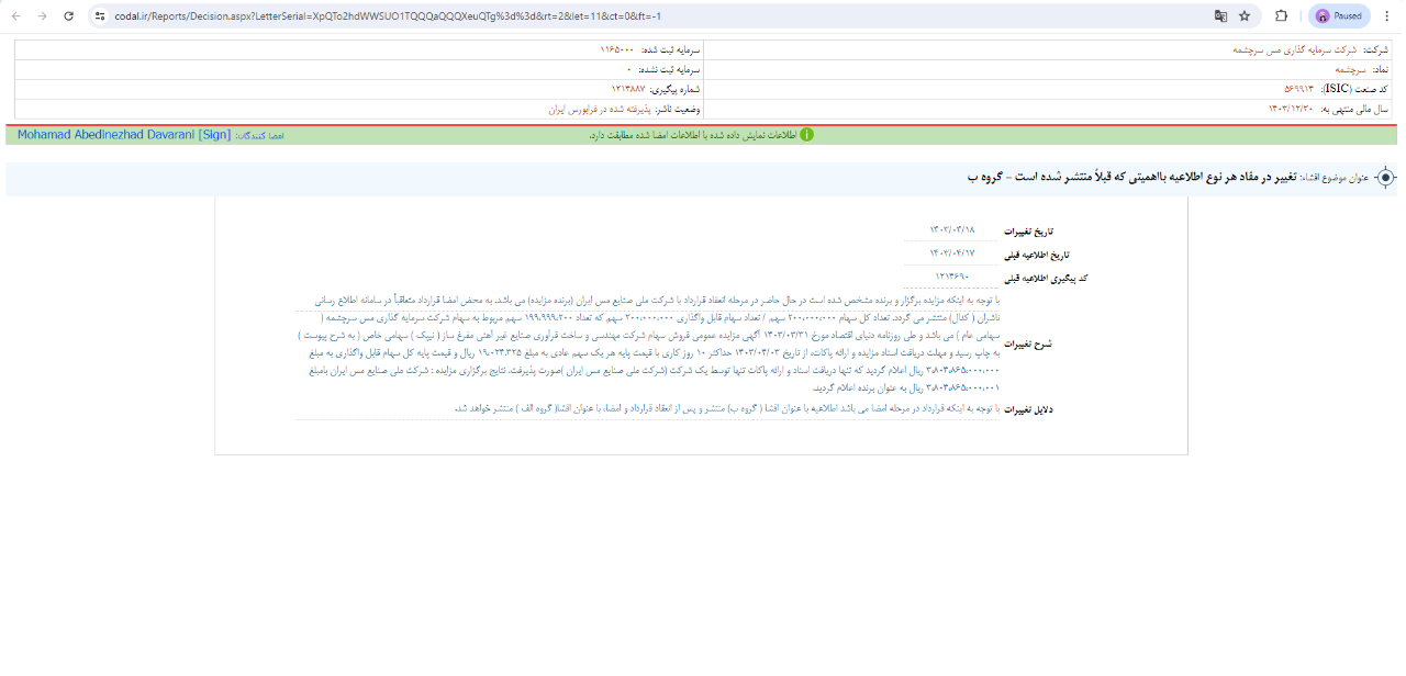 افشای اطلاعات بااهمیت،تغيير در مفاد هر نوع اطلاعيه بااهميتي كه قبلاً منتشر شده است - گروه الف