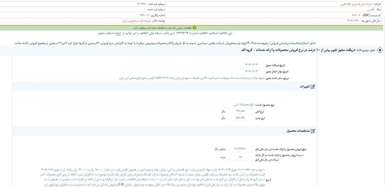 افشای اطلاعات بااهمیت،دريافت مجوز تغيير بيش از 10 درصد در نرخ فروش محصولات یا ارائه خدمات - گروه الف