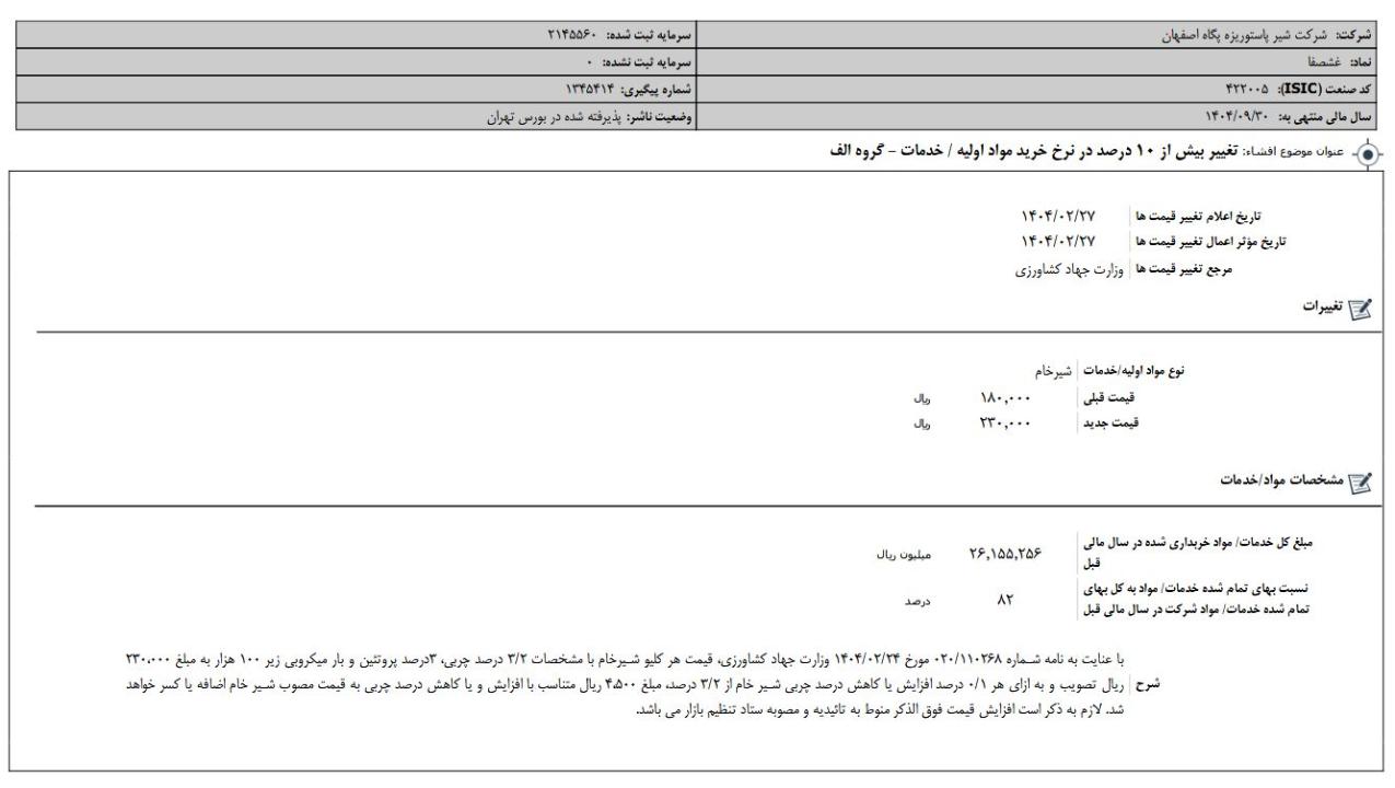 افشای اطلاعات بااهمیت، تغییر بیش از 10% در نرخ خرید مواد اولیه - خدمات ، گروه الف