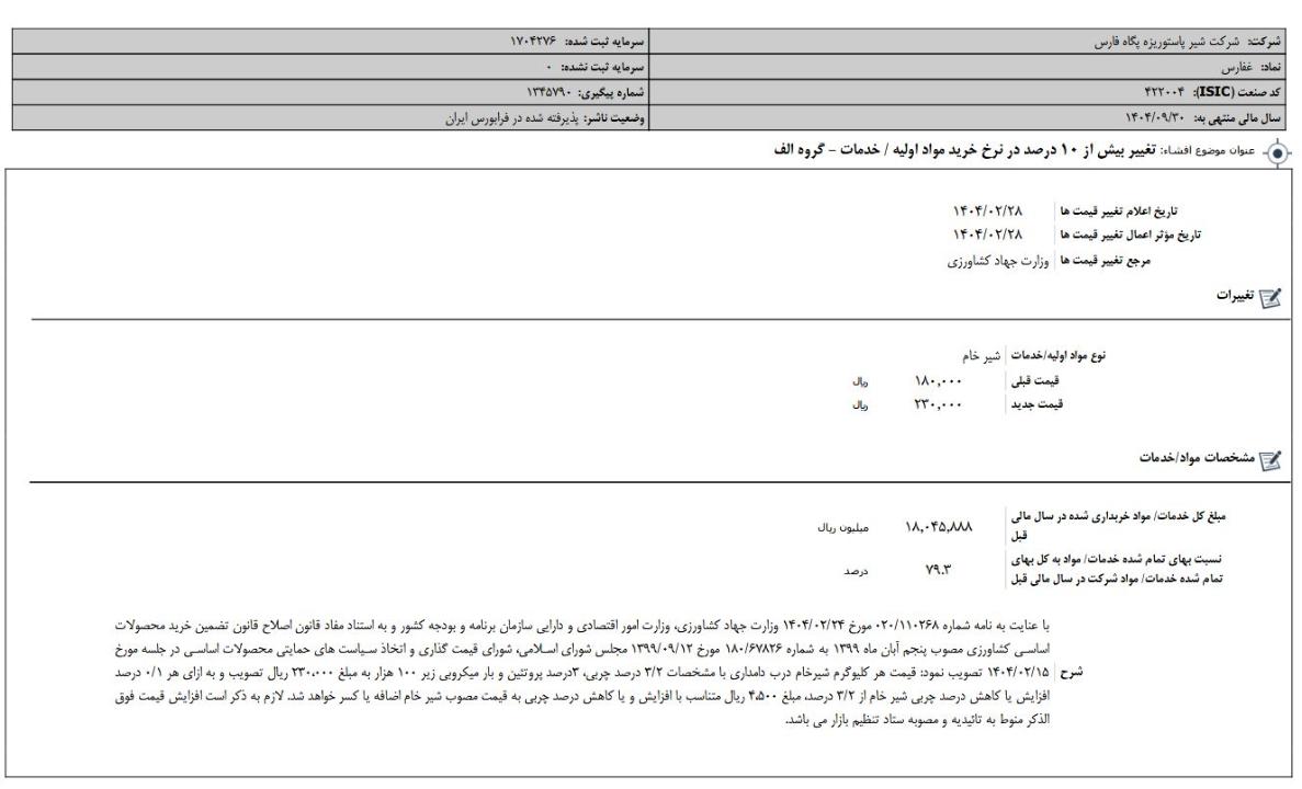 افشای اطلاعات بااهمیت،تغییر بیش از 10% در نرخ خرید مواد اولیه- خدمات ، گروه الف