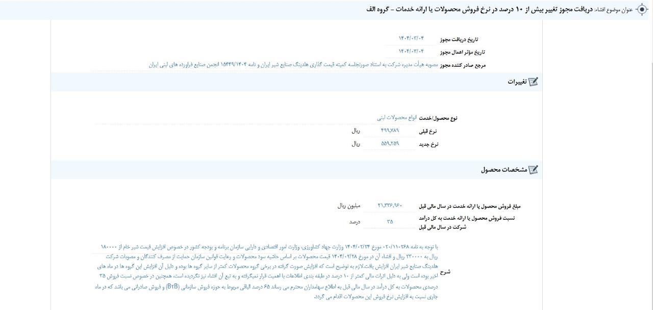 افشای اطلاعات بااهمیت،دريافت مجوز تغيير بيش از 10 درصد در نرخ فروش محصولات یا ارائه خدمات - گروه الف