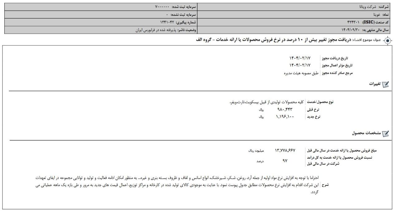 افشای اطلاعات بااهمیت،دريافت مجوز تغيير بيش از 10 درصد در نرخ فروش محصولات یا ارائه خدمات - گروه الف