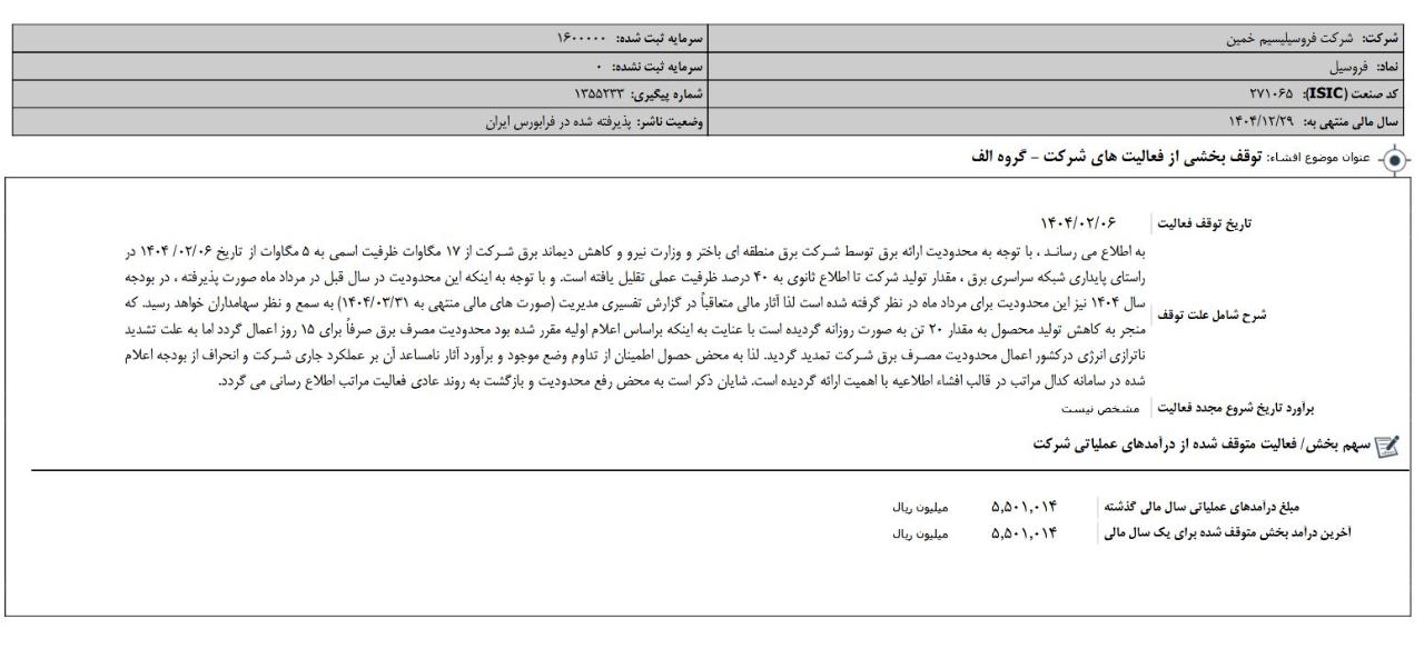 افشای اطلاعات بااهمیت، توقف تمامي فعاليت هاي شركت - گروه الف