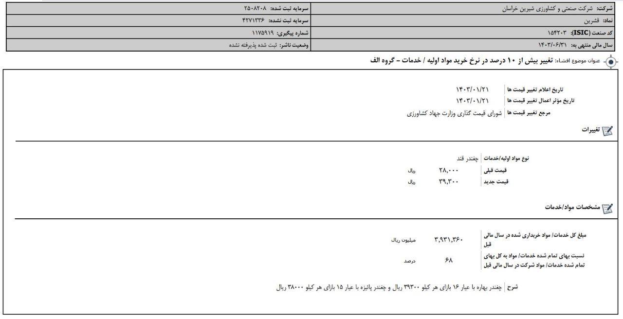 افشای اطلاعات بااهمیت،تغيير بيش از 10 درصد در نرخ خريد مواد اوليه - خدمات ، گروه الف