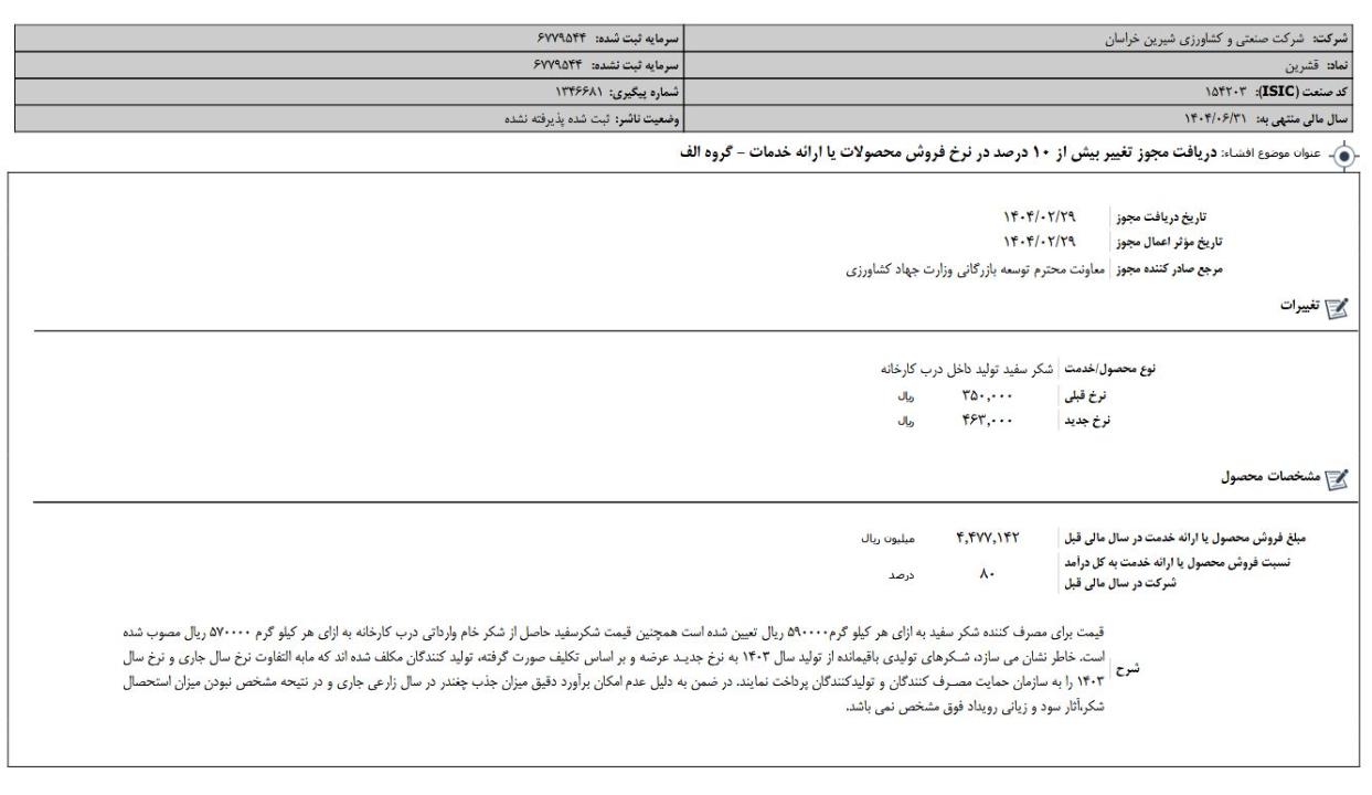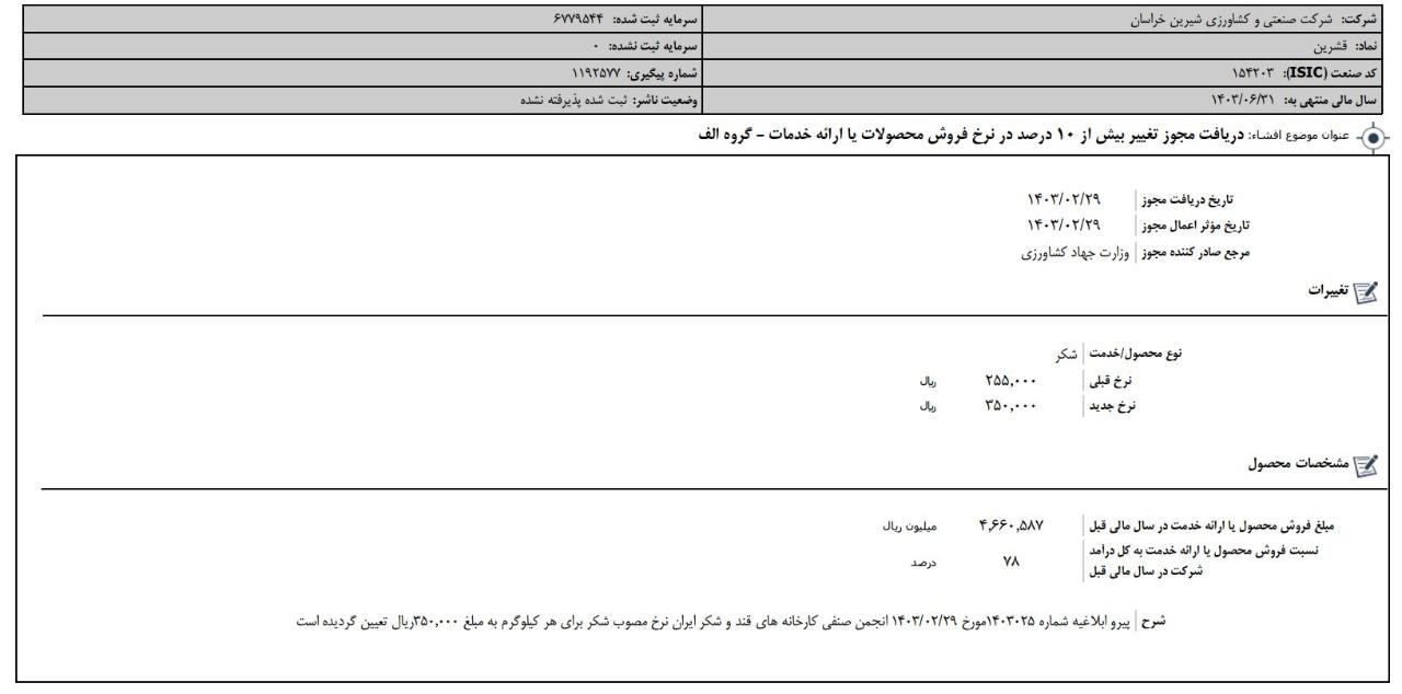 افشای اطلاعات بااهمیت، دريافت مجوز تغيير بيش از 10 درصد در نرخ فروش محصولات یا ارائه خدمات - گروه الف