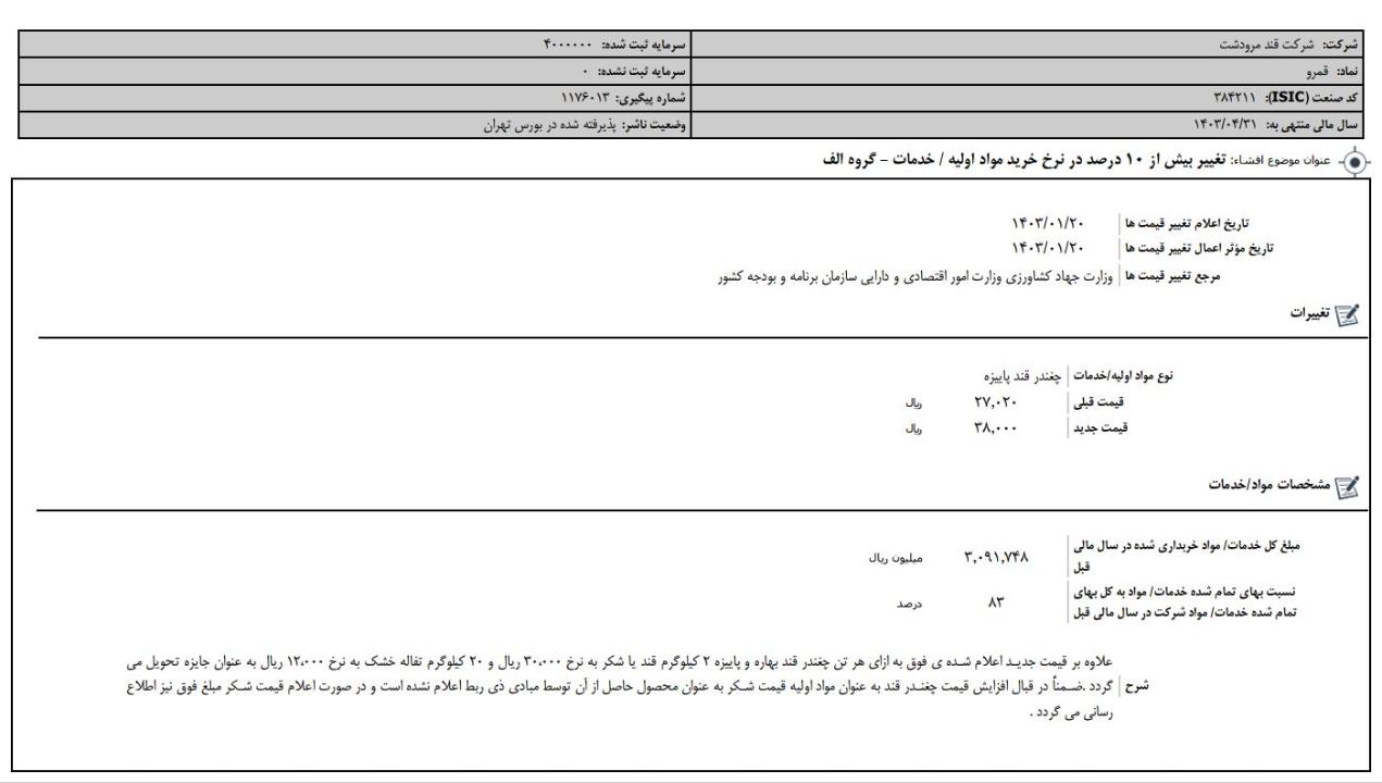 افشای اطلاعات بااهمیت، تغيير بيش از 10 درصد در نرخ خريد مواد اوليه - خدمات ، گروه الف