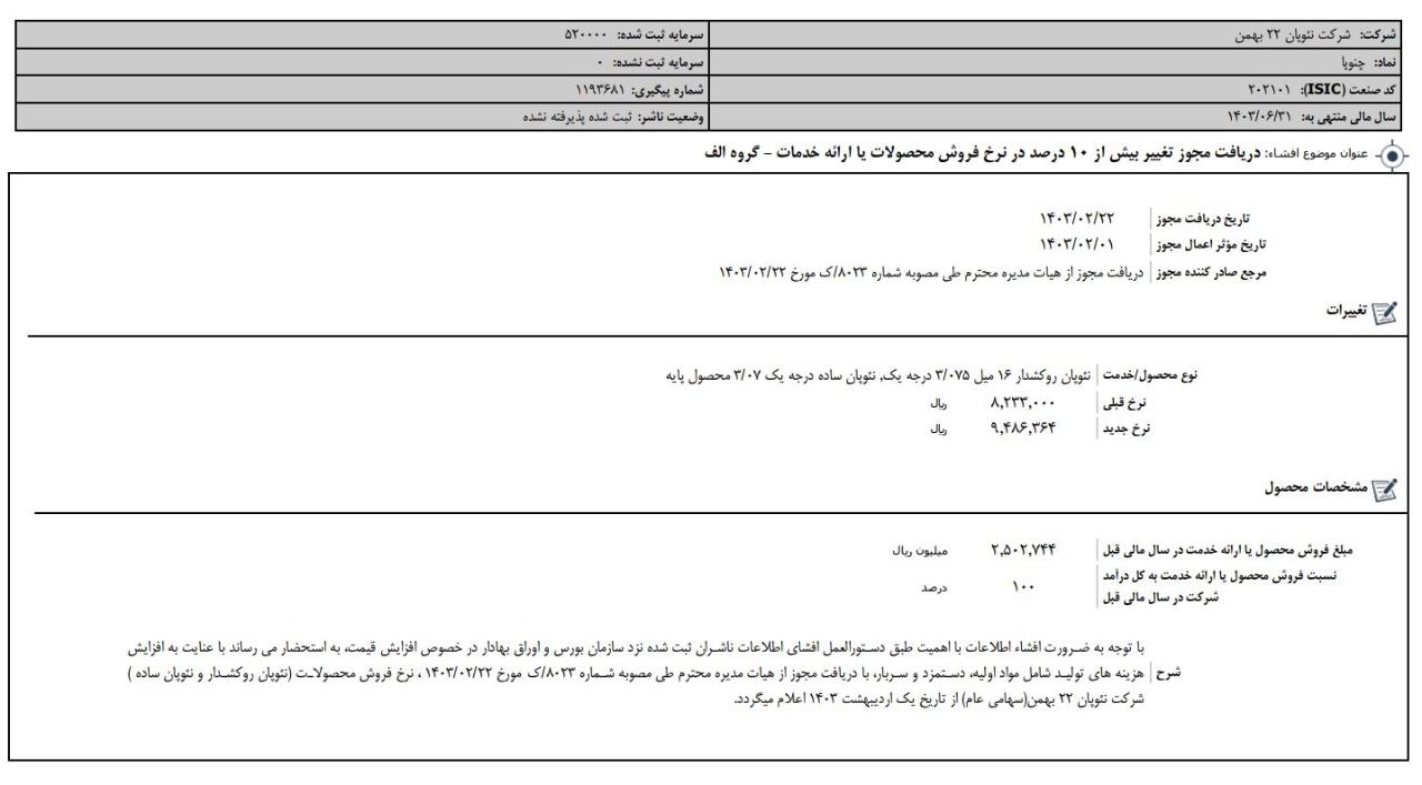 افشای اطلاعات بااهمیت،دريافت مجوز تغيير بيش از 10 درصد در نرخ فروش محصولات یا ارائه خدمات - گروه الف