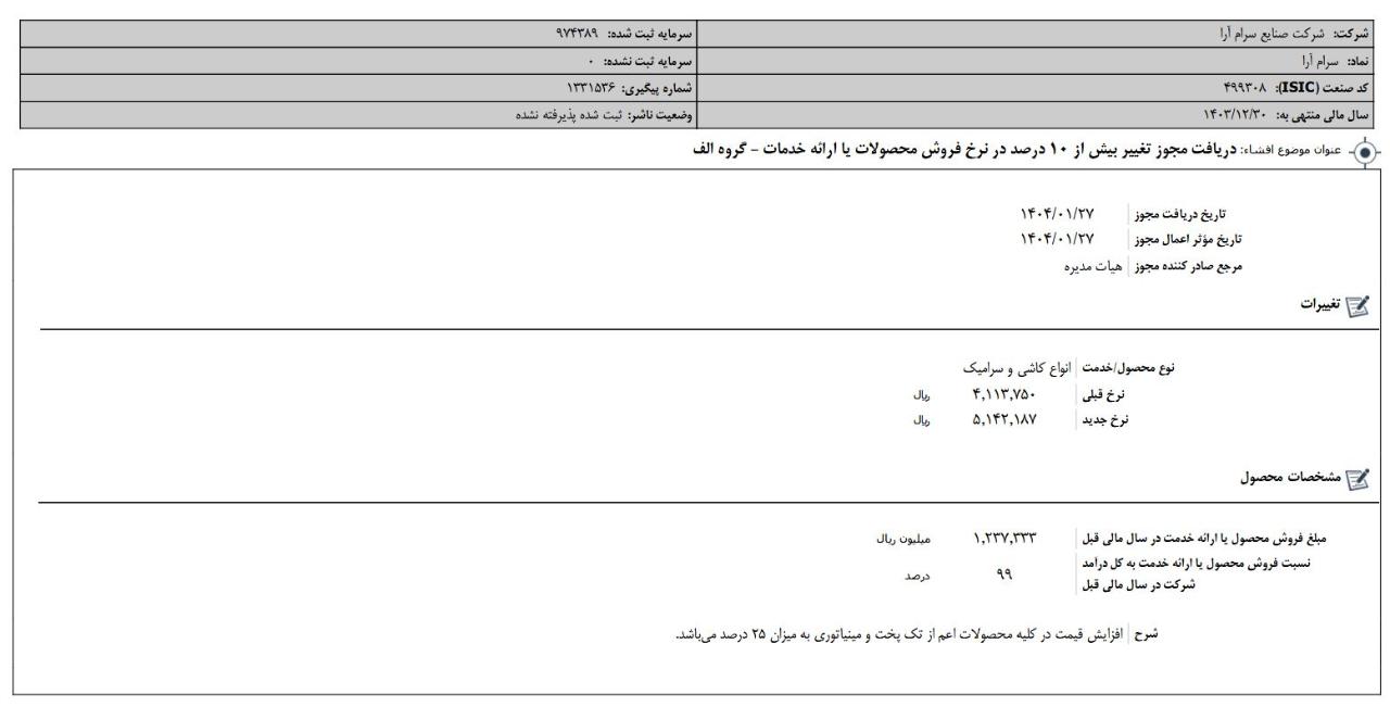 افشای اطلاعات بااهمیت،دريافت مجوز تغيير بيش از 10 درصد در نرخ فروش محصولات یا ارائه خدمات - گروه الف