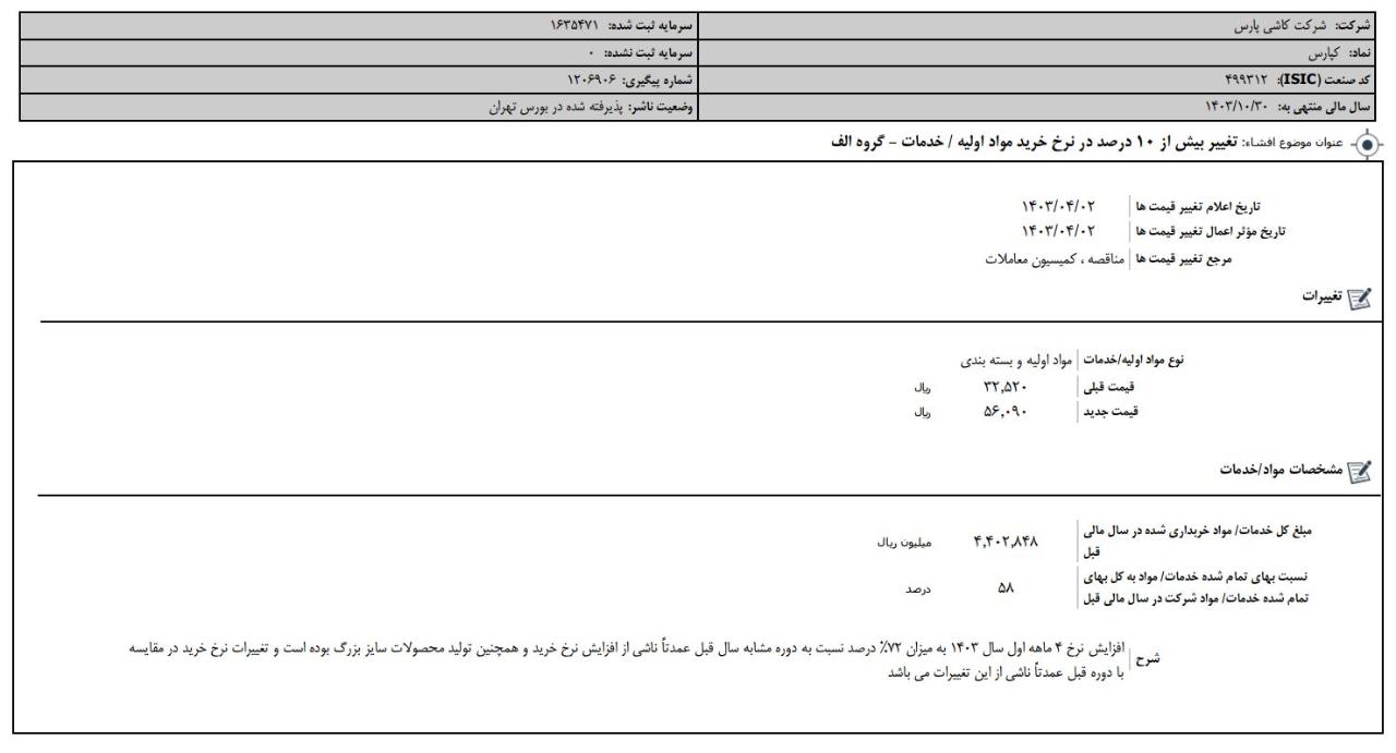 نامه کپارس به بورس در خصوص افزایش قیمت محصولات
