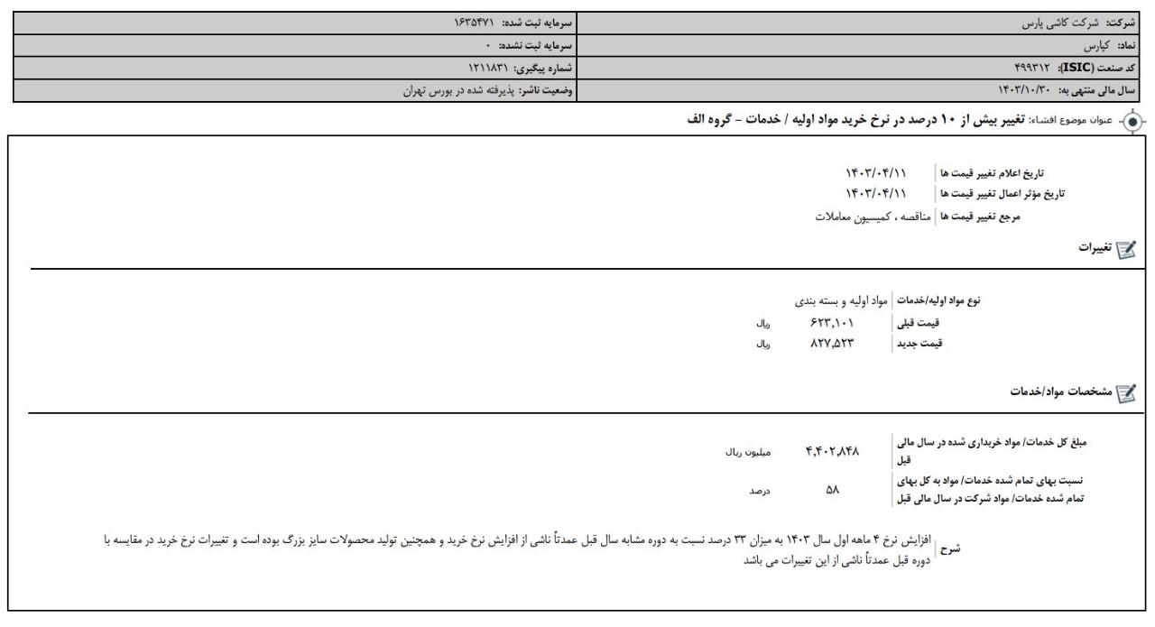 افشای اطلاعات بااهمیت،تغيير بيش از 10 درصد در نرخ خريد مواد اوليه،خدمات ،گروه الف
