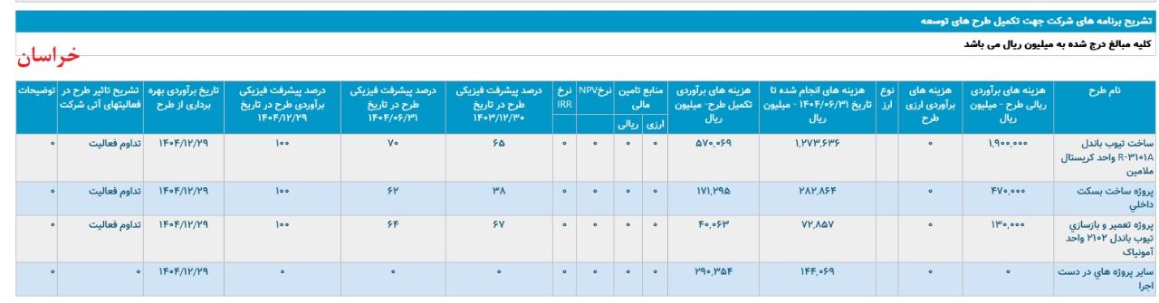 * ساخت تيوب باندل R-۳۱۰۱A واحد کريستال ملامين، با هزینه ی برآوردی تکمیل طرح معادل 57 میلیارد تومان که تاریخ برآوردی بهره برداری از طرح اسفند1404 اعلام شده است.