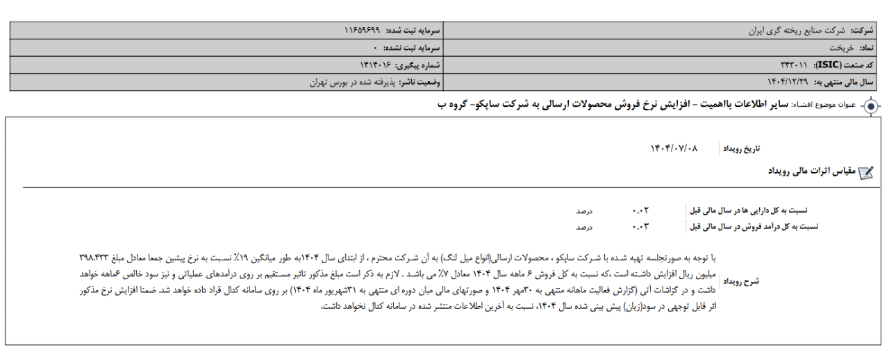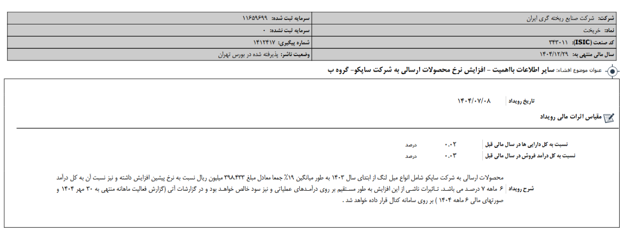 افشای اطلاعات بااهمیت،افزایش نرخ محصولات ارسالی به شرکت ساپکو-گروه ب