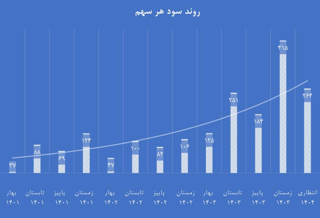 شرکت در سال گذشته به 974ريال سود رسید و سیاست تقسیم سود حدود 35درصد خواهد بود. برای سال 1404 در سناریو پایه سودآوری به 1050ريال می رسد با این حال توجه کنیم که در سناریو مزبور افزایش درآمد شرکت 20درصد فرض شده اما در 6 سال اخیر کمترین نرخ رشد درآمد شرکت 40درصد و در 8 سال اخیر کمترین رشد درآمد شرکت 30درصد بوده است که در این صورت 1270ريال سود محقق می شود اما در حال حاضر با توجه به گزارش های ماهانه، بهتر است که محافظه کارانه پیشبینی کنیم...