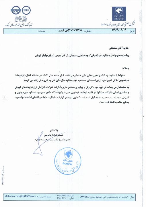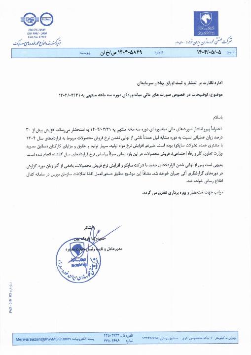 در خصوص صورتهای مالی میاندوره ای دوره 3 ماهه منتهی به 1404.03.31
