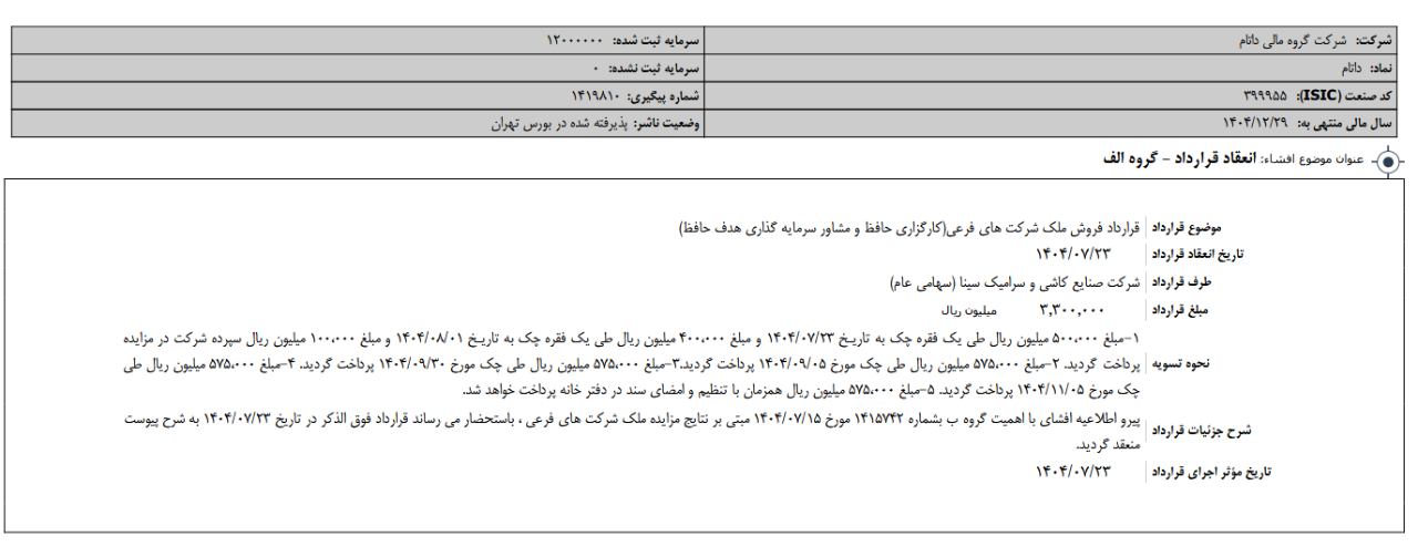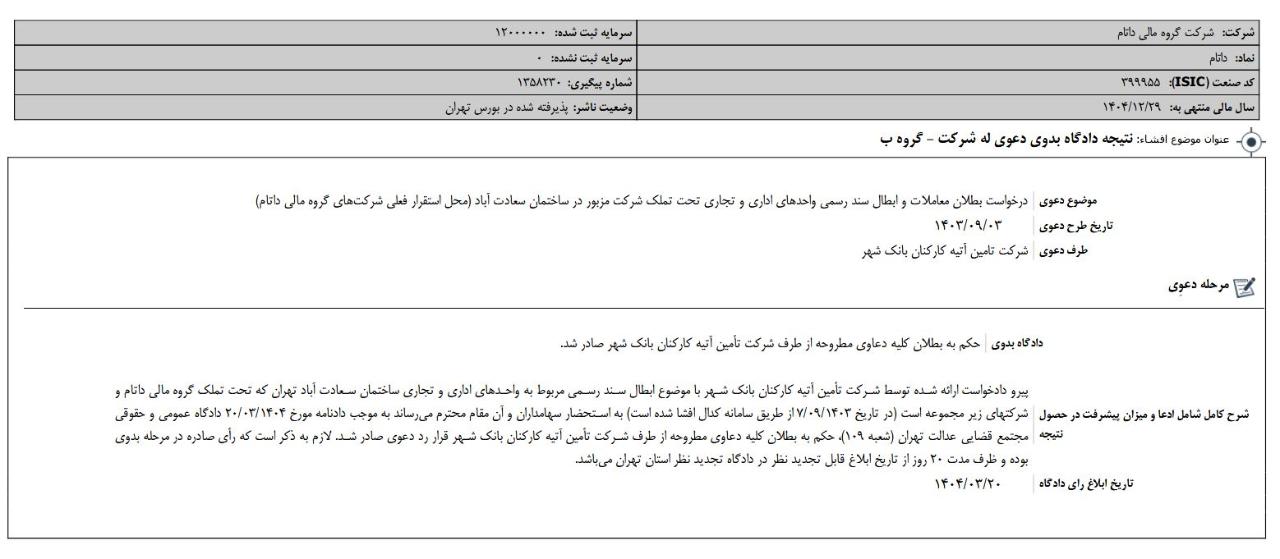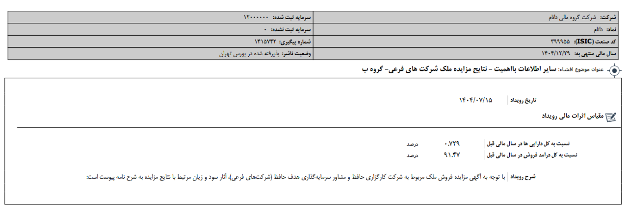 مجمع عمومی عادی سالیانه شرکت گروه مالي داتام روز 20 خرداد 1404 با حضور 92.07 درصد سهامداران برگزار شد و با تصویب مجمع از سود 300 ریالی ایجاد شده مبلغ 130 ریال بین سهامداران تقسیم شد.