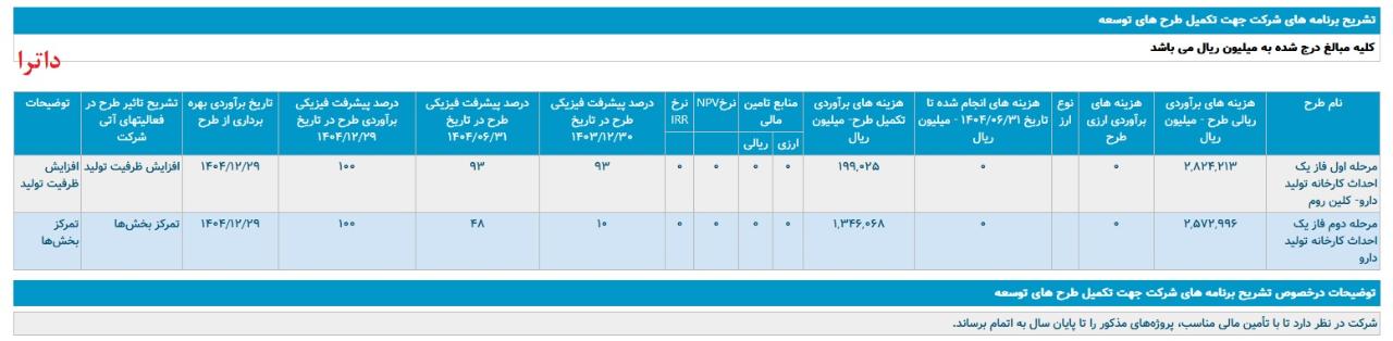 * مرحله دوم فاز یک احداث کارخانه تولید دارو ، با هزینه ی برآوردی تکمیل طرح معادل 135 میلیارد تومان که تاریخ برآوردی بهره برداری از طرح اسفند1404 اعلام شده است.